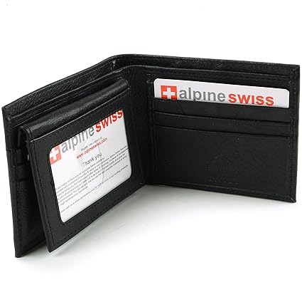 Men's Leather Wallet By Alpine Swiss Product Features: Measures 4.37" x 3.37" x 0.5" Genuine Leather 2 ID Windows 7 Credit Card Slots 2 Additional Pockets Full Size Bill Section Removable Passcase Flap with ID Window Quality Workmanship with 8 stitches per inch MSRP: $45.00