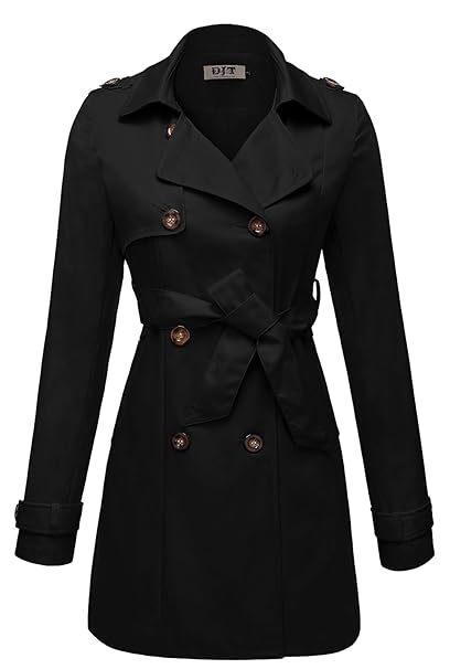 - Double-breasted trench coat featuring notched collar,side-entry front pockets,and belt with self tie closure