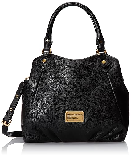 This pebbled leather Marc by Marc Jacobs handbag features a logo plate at the front and pleating at the bottom. Spring-lock strap gathers top. Gold hardware. Double rolled handles and detachable, adjustable shoulder strap. Magnetic-snap main compartment closure. Lined interior features zip pocket and 2 patch pockets.