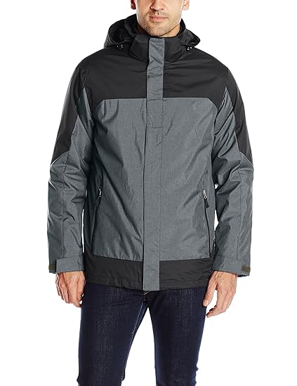 - Three-in-one color-block jacket featuring removable hood, zip front with hook-and-loop overlay, and zippered hand pockets