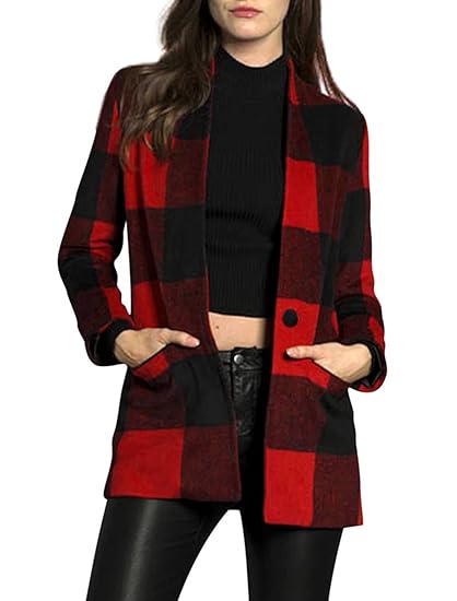 Allegra K checks coat is timelessly cool. Featuring red and black checks pattern, shawl collar, two pockets front and smoothly lining, this casual piece has a roomy boyfriend-inspired cut that is ideal for fall winter layering. Wear yours with layered tops and jeans.