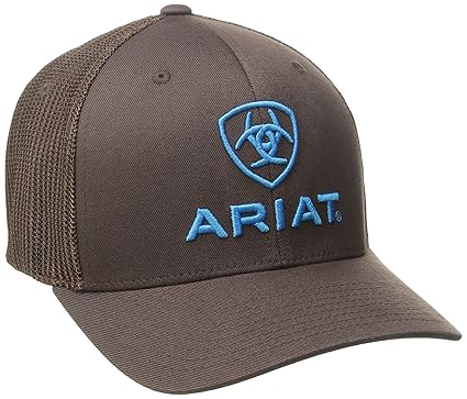 Flex fit cap with brown spandex material, with blue under bill, and a blue raised logo on the crown. Ariat embroidered in blue on the back.