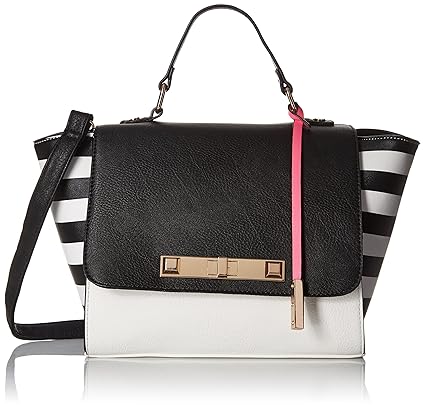 Ladies satchel in color blocking. Front turn lock and hanging charm.