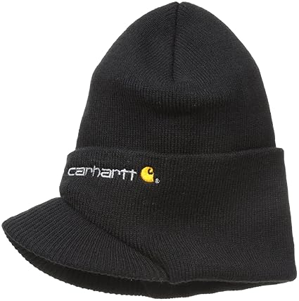 Carhartt's knit hat with visor offers the warmth and the one-size-fits-all versatility of a knit pull-on plus the ability to shade your eyes from bright sun or snow. Durable and comfortable, it's made of 100 percent acrylic, stretchable rib-knit fabric, and features the Carhartt logo embroidered on the front.