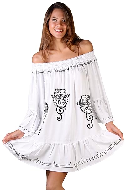 Pretty Feminine tunic dress takes you through all seasons in this flowing and flattering top embellished with beautiful embroidery in a circular flower motif and highlighted with little sequins. Perfect to wear with leggings, or skinny jeans. Pair with boots for cooler weather, and wear with sandals when it warms up. Ideal weight fabric is extremely comfortable and has a nice swing when you move. An elasticized neckline allows for off the shoulder wearing while the long billow sleeves lend it a graceful ease. This versatile piece which can be worn as a dress, top, blouse or tunic, also features a full ruffle at the bottom, and its loose easy shape is flattering on all body types. Wear it on its own, or try belting it on the waist or hip. This classy and stylish top will win you many compliments. Back From Bali is dedicated to creating beautiful, quality clothing with a heart. All of our items are crafted, sewn and painted by hand in Bali, by local artists and women who own small home businesses. For over 20 years, we have nurtured fair, honest and caring relationships with our artisans and their families, so you can feel as good about wearing our products as they feel about making them.